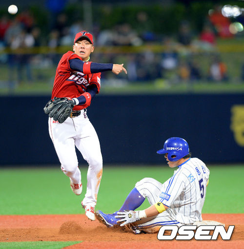 10일 오후 경북 포항구장에서 열린 '2013 한국야쿠르트 세븐 프로야구' 삼성 라이온즈와 KIA 타이거즈의 경기,3회말 무사 1루 삼성 이승엽의 내야땅볼때 KIA 안치홍이 1루 주자 조동찬을 포스아웃 시킨후 병살시도하고 있다. 타자 이승엽은 1루에서 세이프.