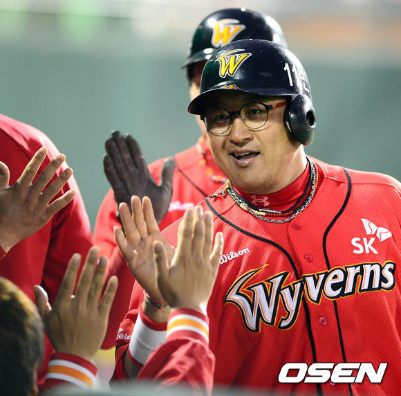 10일 오후 서울 목동구장에서 열린 '2013 한국야쿠르트 세븐 프로야구' 넥센 히어로즈와 SK 와이번스의 경기 4회초 1사 2,3루 김강민의 2타점 2루타에 홈을 밟은 2루주자 조인성이 덕아웃에서 동료들과 하이파이브를 하고 있다.