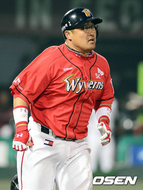 10일 오후 서울 목동구장에서 열린 '2013 한국야쿠르트 세븐 프로야구' 넥센 히어로즈와 SK 와이번스의 경기 4회초 1사 2,3루 조인성이 1타점 2루타를 치고 달리고 있다.