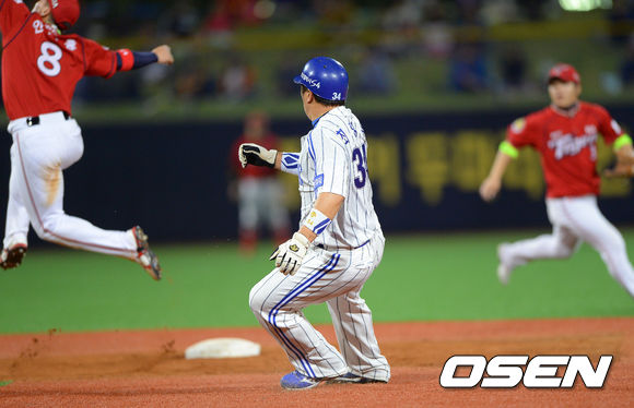 10일 오후 경북 포항구장에서 열린 '2013 한국야쿠르트 세븐 프로야구' 삼성 라이온즈와 KIA 타이거즈의 경기, 3회말 1사 1,3루 삼성 박석민의 삼진아웃때 1루 주자 최형우가 도루 시도하며 멈칫 거리고 있다. KIA 이성우 포수의 송구가 외야로 빠지면서 3루 주자 이승엽은 득점, 최형우는 3루 까지 진루했다.