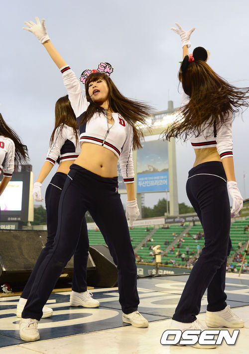 10일 오후 서울 잠실야구장에서 열린 2013 한국야쿠르트 세븐프로야구 두산 베어스와 NC 다이노스의 경기, 두산 치어리더가 화려한 공연을 펼치고 있다.