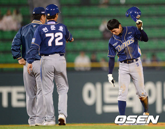 10일 오후 서울 잠실야구장에서 열린 2013 한국야쿠르트 세븐프로야구 두산 베어스와 NC 다이노스의 경기, 6회초 2사 1루에서 NC 박정준 타석 때 도루에 성공한 1루주자 김종호가 통증을 호소 하며 전준호 코치와 이야기를 나누고 있다.
