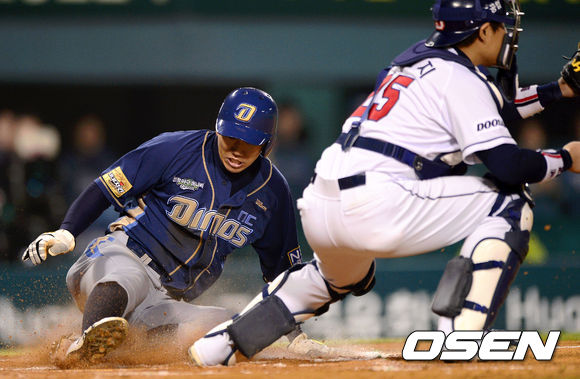 10일 오후 서울 잠실야구장에서 열린 2013 한국야쿠르트 세븐프로야구 두산 베어스와 NC 다이노스의 경기, 7회초 2사 2루에서 NC 지석훈의 좌전 적시타 때 2루주자 모창민이 홈으로 쇄도해 득점에 성공하고 있다.