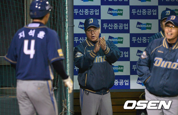 10일 오후 서울 잠실야구장에서 열린 2013 한국야쿠르트 세븐프로야구 두산 베어스와 NC 다이노스의 경기, 7회초 2사 1,2루에서 NC 김경문 감독이 노진혁의 우전 안타 때 홈을 밟은 지석훈을 바라보며 박수를 치고 있다.