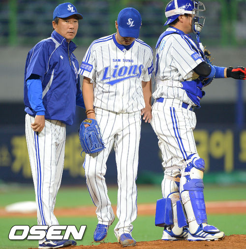 10일 오후 경북 포항구장에서 열린 '2013 한국야쿠르트 세븐 프로야구' 삼성 라이온즈와 KIA 타이거즈의 경기, 7회초 1사 1,2루 삼성 선발투수 장원삼이 시창민과 교체되고 있다