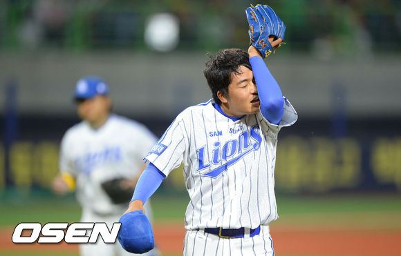 10일 오후 경북 포항구장에서 열린 '2013 한국야쿠르트 세븐 프로야구' 삼성 라이온즈와 KIA 타이거즈의 경기, 7회초 2사 1,2루 실점 위기를 넘긴 삼성 심창민 투수가 나지완을 삼진아웃 시킨 후 땀을 닦으며 더그아웃으로 들어가고 있다