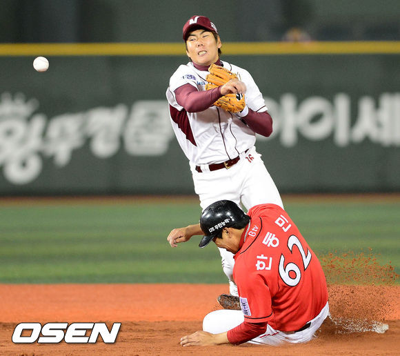 10일 오후 서울 목동구장에서 열린 '2013 한국야쿠르트 세븐 프로야구' 넥센 히어로즈와 SK 와이번스의 경기 7회초 1사 1,3루 박재상의 투수 앞 땅볼을 강정호가 2루에서 한동민을 포스아웃시킨 후 1루로 송구하고 있다. 그사이 3루주자 김상현은 홈인. 1루에서는 세이프.