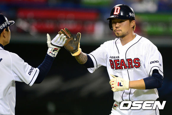 10일 오후 서울 잠실야구장에서 열린 2013 한국야쿠르트 세븐프로야구 두산 베어스와 NC 다이노스의 경기, 7회말 2사 2루에서 두산 양의지의 우전 동점 적시타 떄 홈을 밟은 2루주자 오재원이 손시헌과 하이파이브를 하고 있다.