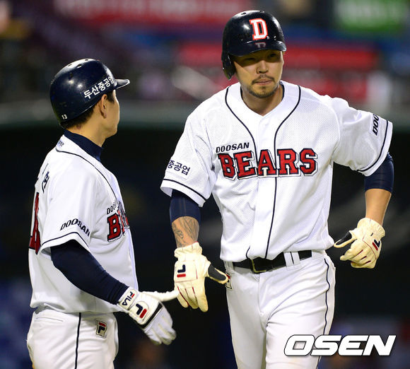 10일 오후 서울 잠실야구장에서 열린 2013 한국야쿠르트 세븐프로야구 두산 베어스와 NC 다이노스의 경기, 7회말 2사 2루에서 두산 양의지의 우전 동점 적시타 떄 홈을 밟은 2루주자 오재원이 손시헌과 하이파이브를 하고 있다.