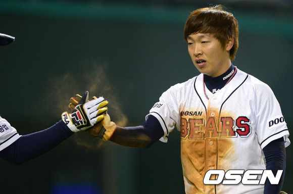 10일 오후 서울 잠실야구장에서 열린 2013 한국야쿠르트 세븐프로야구 두산 베어스와 NC 다이노스의 경기, 8회말 1사 1,3루에서 역전 득점에 성공한 두산 정수빈이 김동주와 하이파이브를 하고 있다.