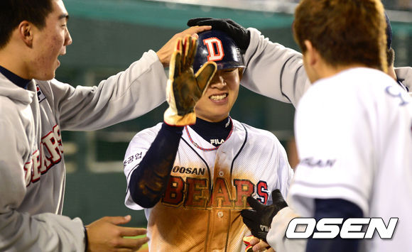 10일 오후 서울 잠실야구장에서 열린 2013 한국야쿠르트 세븐프로야구 두산 베어스와 NC 다이노스의 경기, 8회말 1사 1,3루에서 두산 최주환의 내야 땅볼 때 홈을 밟은 3루주자 정수빈이 덕아웃에서 동료들과 환호하고 있다.
