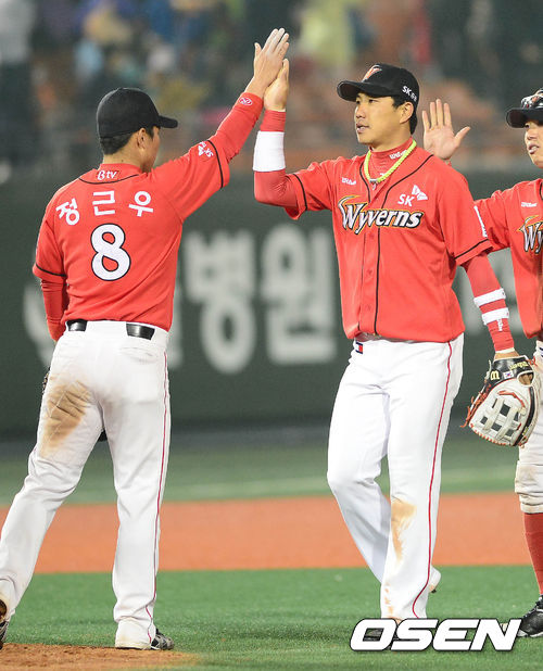 10일 오후 서울 목동구장에서 열린 '2013 한국야쿠르트 세븐 프로야구' 넥센 히어로즈와 SK 와이번스의 경기 종료 후 정근우와 김강민이 하이파이브를 하고 있다.
