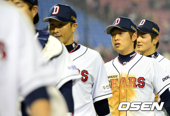 경기 종료 후 두산 정수빈이 동료들과 승리의 기쁨을 나누고 있다. /sunday@osen.co.kr