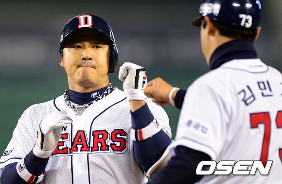 8회말 1사 1루에서 두산 홍성흔이 우전 안타를 치고 김민재 코치와 환호하고 있다. /sunday@osen.co.kr