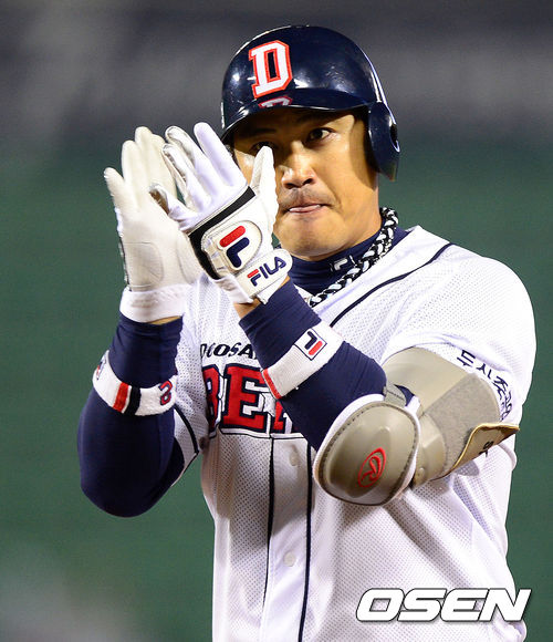 8회말 1사 1루에서 두산 홍성흔이 우전 안타를 치고 환호하고 있다. /sunday@osen.co.kr