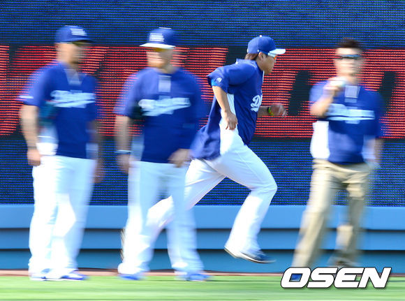 11일(이하 한국시간) 미국 캘리포니아 로스앤젤레스 다저스타디움에서 열리는 LA 다저스와 마이애미 말린스의 경기를 앞두고 다저스 류현진이 외야에서 달리기로 몸을 풀고 있다.