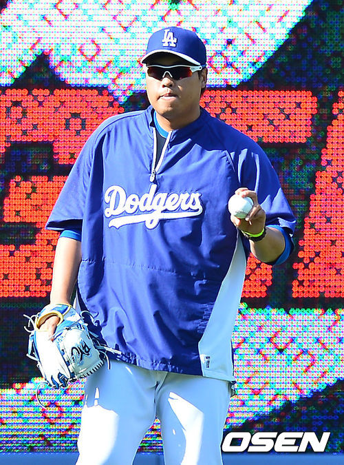 11일(이하 한국시간) 미국 캘리포니아 로스앤젤레스 다저스타디움에서 열리는 LA 다저스와 마이애미 말린스의 경기를 앞두고 다저스 류현진이 외야에서 캐치볼로 몸을 풀고 있다.