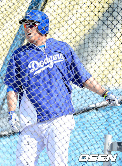 11일(이하 한국시간) 미국 캘리포니아 로스앤젤레스 다저스타디움에서 열리는 LA 다저스와 마이애미 말린스의 경기를 앞두고 다저스 류현진이 타격연습 중 자신의 타구를 바라보고 있다.