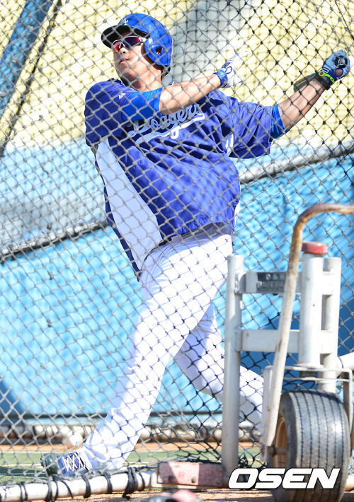 11일(이하 한국시간) 미국 캘리포니아 로스앤젤레스 다저스타디움에서 열리는 LA 다저스와 마이애미 말린스의 경기를 앞두고 다저스 류현진이 타격 연습을 하고 있다.
