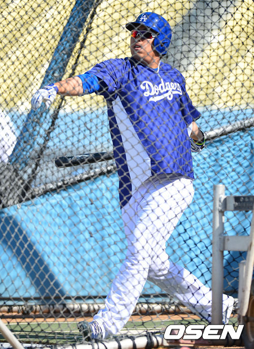 11일(이하 한국시간) 미국 캘리포니아 로스앤젤레스 다저스타디움에서 열리는 LA 다저스와 마이애미 말린스의 경기를 앞두고 다저스 류현진이 타격 연습을 하고 있다.