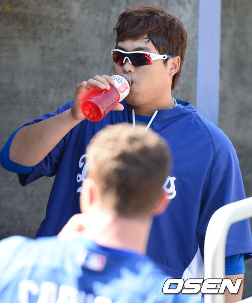 11일(이하 한국시간) 미국 캘리포니아 로스앤젤레스 다저스타디움에서 열리는 LA 다저스와 마이애미 말린스의 경기를 앞두고 다저스 류현진이 외야에서 몸을 푼뒤 더그아웃으로 들어와 음료를 마시고 있다.