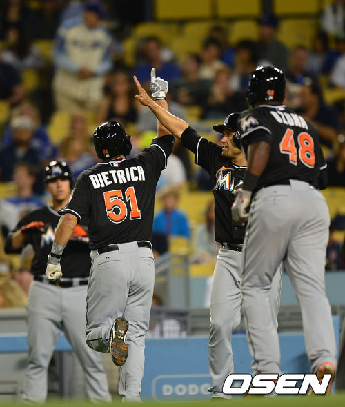 11일(이하 한국시간) 미국 캘리포니아 로스앤젤레스 다저스타디움에서 LA 다저스와 마이애미 말린스의 경기가 열렸다. 4회초 말린스 공격 2사 1, 2루 상황 7번 디트리치가 우월 동점 스리런포를 날리고 동료들과 기쁨을 나누고 있다.