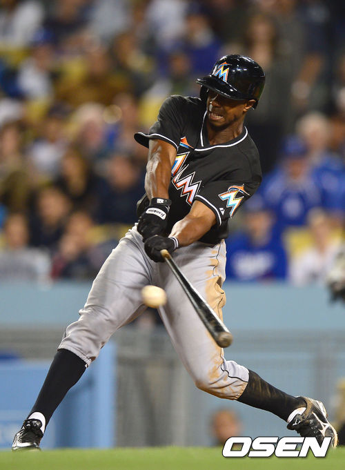 11일(이하 한국시간) 미국 캘리포니아 로스앤젤레스 다저스타디움에서 LA 다저스와 마이애미 말린스의 경기가 열렸다. 7회초 말린스 공격 무사 2, 3루 상황 1번 후안 피에르가 역전 1타점 좌전 적시타를 날리고 있다.
