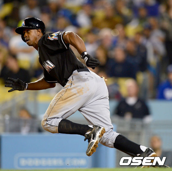 11일(이하 한국시간) 미국 캘리포니아 로스앤젤레스 다저스타디움에서 LA 다저스와 마이애미 말린스의 경기가 열렸다. 7회초 말린스 공격 무사 2, 3루 상황 1번 후안 피에르가 역전 1타점 좌전 적시타를 날리고 타구를 바라보며 1루를 향해 뛰고 있다.