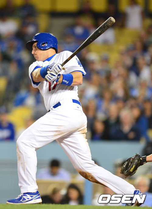 11일(이하 한국시간) 미국 캘리포니아 로스앤젤레스 다저스타디움에서 LA 다저스와 마이애미 말린스의 경기가 열렸다. 8회말 다저스 공격 1사 2루 상황 6번 A.J 엘리스가 추격의 1타점 적시타를 날리고 있다.