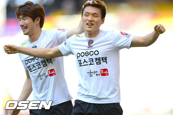 11일 오후 부산아시아드경기장에서 열린 현대오일뱅크 K리그 클래식 2013 부산 아이파크와 포항 스틸러스의 경기, 후반 포항 이명주가 동점골을 넣고 환호하고 있다