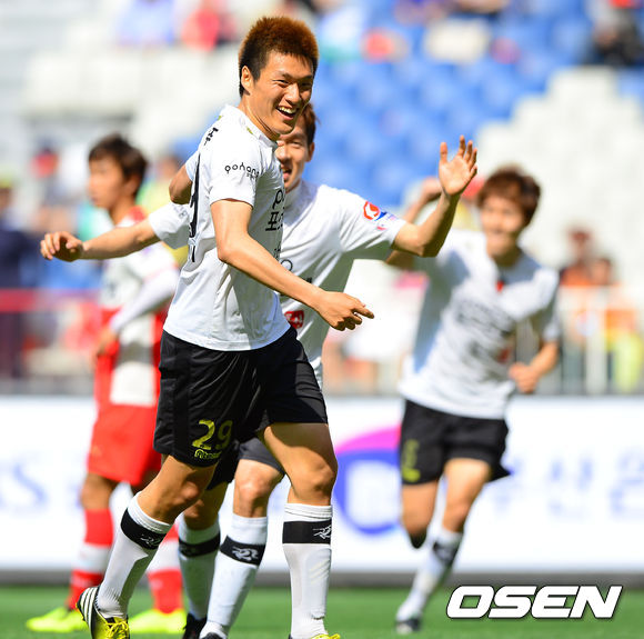 11일 오후 부산아시아드경기장에서 열린 현대오일뱅크 K리그 클래식 2013 부산 아이파크와 포항 스틸러스의 경기, 후반 포항 이명주가 동점골을 넣고 환호하고 있다