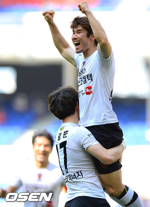11일 오후 부산아시아드경기장에서 열린 현대오일뱅크 K리그 클래식 2013 부산 아이파크와 포항 스틸러스의 경기, 후반 포항 조찬호가 동점골을 넣고 환호하고 있다