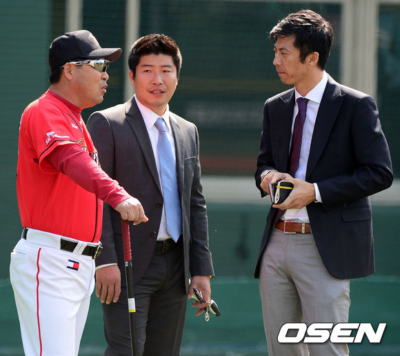 11일 오후 서울 목동야구장에서 열리는 '2013 한국야쿠르트 세븐 프로야구' 넥센 히어로즈와 SK 와이번스의 경기, 경기에 앞서 SK 이만수 감독이 박재홍, 손혁 해설위원과 이야기를 나누고 있다.