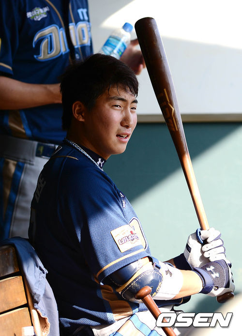 11일 오후 서울 잠실구장에서 열린 '2013 한국야쿠르트 세븐 프로야구' 두산 베어스와 NC다이노스의 경기 시작 전 나성범이 덕아웃에서 경기 시작을 기다리고 있다.