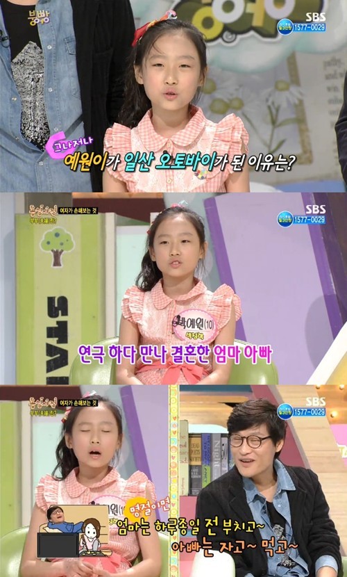 예원 양의 솔직한 입담은 계속해서 이어졌다. 예원 양은 "결혼하면 여자가 남자보다 손해인 것 같다"며 "엄마 아빠가 연극을 하다가 만났는데 아빠는 결혼 후에도 연기를 하고 계시지만 엄마는 못 하신다"고 말했다.