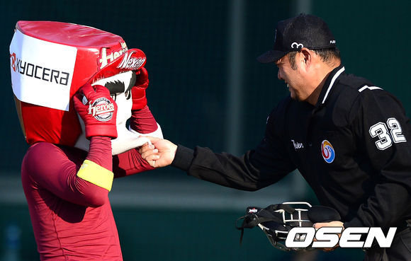 11일 오후 서울 목동야구장에서 열린 '2013 한국야쿠르트 세븐 프로야구' 넥센 히어로즈와 SK 와이번스의 경기, 2회 공수교대에 턱돌이가 이영재 구심에게 장난을 치며 턱을 잡히고 있다.