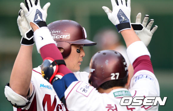 11일 오후 서울 목동야구장에서 열린 '2013 한국야쿠르트 세븐 프로야구' 넥센 히어로즈와 SK 와이번스의 경기, 5회말 무사에서 넥센 이성열이 동점 솔로포를 날리고 허도환과 하이파이브를 하고 있다.
