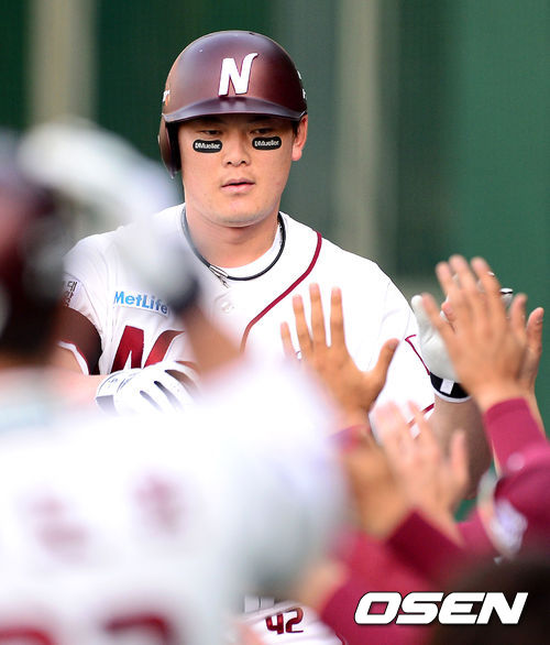 11일 오후 서울 목동야구장에서 열린 '2013 한국야쿠르트 세븐 프로야구' 넥센 히어로즈와 SK 와이번스의 경기, 5회말 무사에서 넥센 이성열이 동점 솔로포를 날리고 더그아웃에서 동료선수들과 하이파이브를 하고 있다.