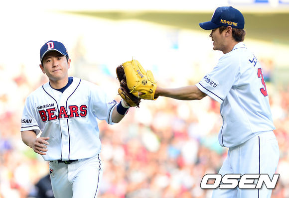 11일 오후 서울 잠실구장에서 열린 '2013 한국야쿠르트 세븐 프로야구' 두산 베어스와 NC다이노스의 경기 5회초 2사 3루 노경은이 김태군을 유격수 땅볼로 처리 한 후 손시헌과 하이파이브를 하고 있다.
