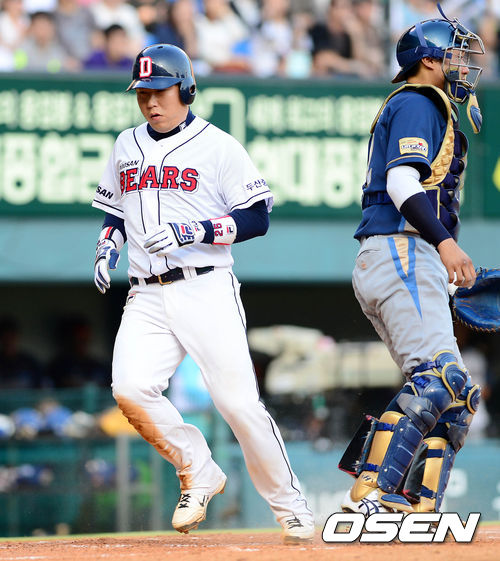 11일 오후 서울 잠실구장에서 열린 '2013 한국야쿠르트 세븐 프로야구' 두산 베어스와 NC다이노스의 경기 5회초 무사 1,2루 이종욱의 1타점 적시타에 2루주자 양의지가 홈을 밟고 있다.