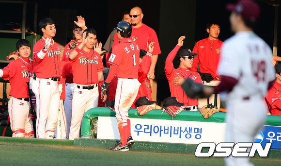 11일 오후 서울 목동야구장에서 열린 '2013 한국야쿠르트 세븐 프로야구' 넥센 히어로즈와 SK 와이번스의 경기, 6회초 1사 3루에서 SK 조동화가 김상현의 우익수 플라이에 홈을 밟고 동료선수들과 기뻐하고 있다.
