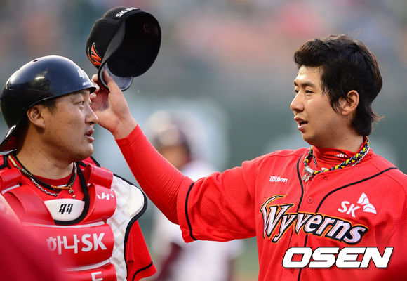 11일 오후 서울 목동야구장에서 열린 '2013 한국야쿠르트 세븐 프로야구' 넥센 히어로즈와 SK 와이번스의 경기, 7회말 2사 2루에서 SK 윤희상이 넥센 김민성을 유격수 라인드라이브로 처리하고 조인성과 이야기를 나누며 더그아웃으로 향하고 있다.