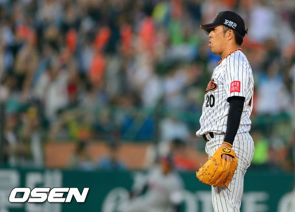 11일 오후 부산 사직구장에서 열린 '2013 한국야쿠르트 세븐 프로야구' 롯데 자이언츠와 LG 트윈스의 경기, 6회초 2사 만루 위기 LG 문선재를 외야플라이로 아웃처리 시킨 롯데 김승회 투수가 한숨을 내쉬고 있다