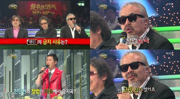 전인권은 11일 오후 방송된 KBS 2TV ‘불후의 명곡-전설을 노래하다(이하 ’불후‘)’ 100회 특집 녹화에 참석, “‘행진’의 금지곡 선정 이유는 창법미숙이었다”고 말했다.