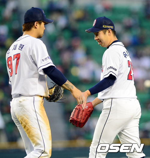 11일 오후 서울 잠실구장에서 열린 '2013 한국야쿠르트 세븐 프로야구' 두산 베어스와 NC다이노스의 경기 8회초 1사 나성범을 1루수 땅볼로 처리한 유희관이 오재원과 하이파이브를 하고 있다.