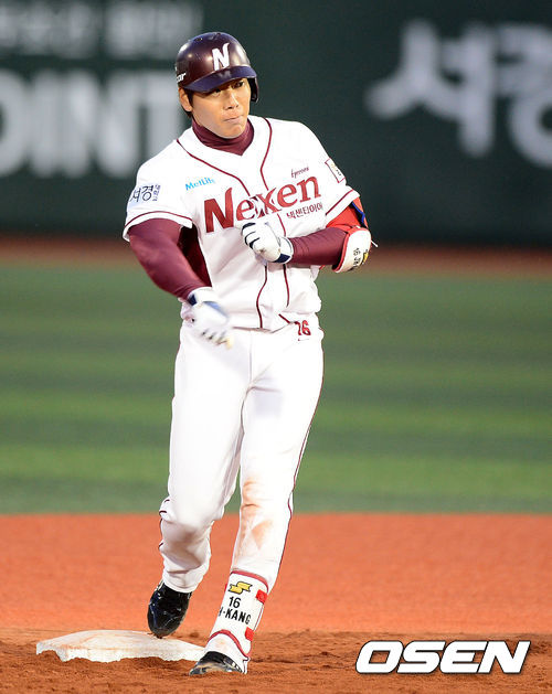 11일 오후 서울 목동야구장에서 열린 '2013 한국야쿠르트 세븐 프로야구' 넥센 히어로즈와 SK 와이번스의 경기, 8회말 2사 만루에서 넥센 강정호가 역전 2타점 적시 2루타를 날리고 어퍼컷 세리머니를 하고 있다.