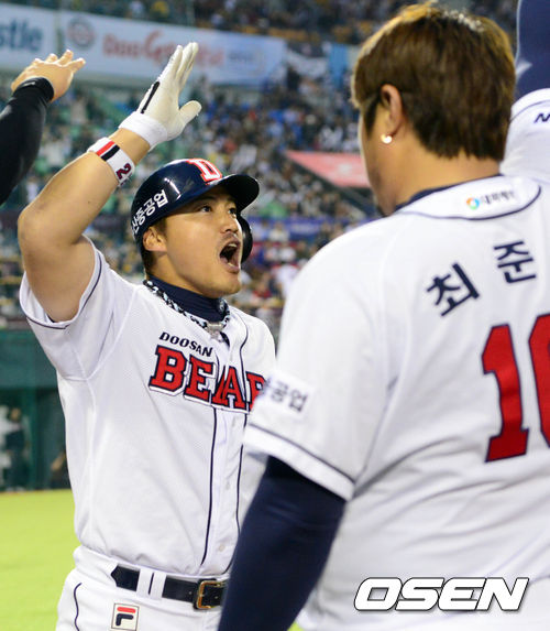 11일 오후 서울 잠실구장에서 열린 '2013 한국야쿠르트 세븐 프로야구' 두산 베어스와 NC다이노스의 경기 8회말 1사 1루 홍성흔이 투런홈런을 친 후 덕아웃에서 동료들과 하이파이브를 하고 있다.
