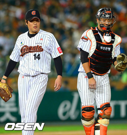 11일 오후 부산 사직구장에서 열린 '2013 한국야쿠르트 세븐 프로야구' 롯데 자이언츠와 LG 트윈스의 경기,8회초 무사 1루 LG 김용의 타석때 대주자 양영동이 태그아웃됐다. 강영식의 투수 교체때 강영식과 강민호가 1루수 박종윤에게 손짓하고 있다