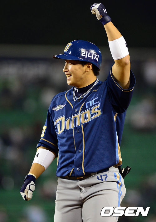 11일 오후 서울 목동구장에서 열린 '2013 한국야쿠르트 세븐 프로야구' 두산 베어스와 NC다이노스의 경기 9회초 2사 만루 나성범이 2타점 적시타를 치고 기뻐하고 있다.
