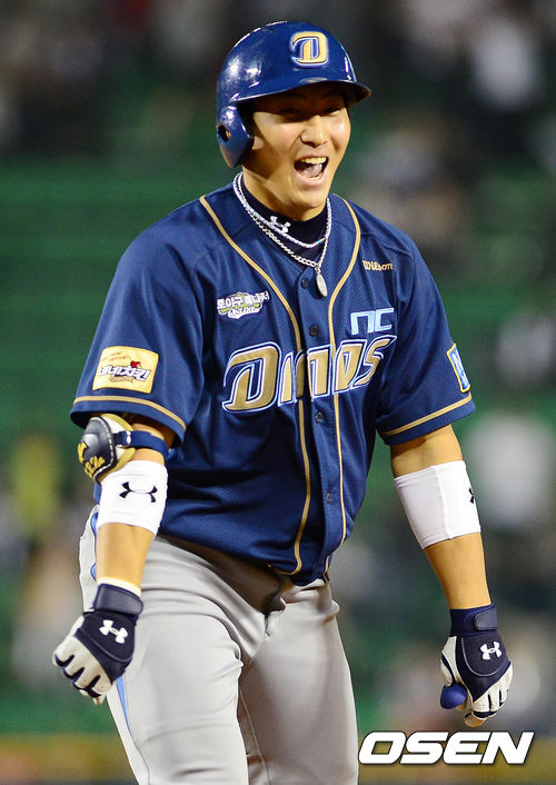 11일 오후 서울 잠실구장에서 열린 '2013 한국야쿠르트 세븐 프로야구' 두산 베어스와 NC다이노스의 경기 9회초 2사 만루 나성범이 2타점 적시타를 치고 기뻐하고 있다.
